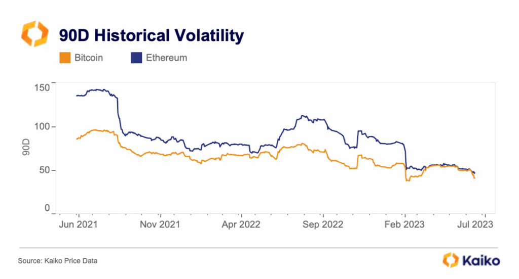 « La volatilité de l’Ether a été multipliée par trois, passant de 150 % en 2021 à 46 % aujourd’hui. Dans le même temps, la volatilité du bitcoin a été divisée par deux, passant de 90 % à 50 %. Historiquement, la volatilité de l’ETH était plus élevée que celle du BTC, mais cet écart a disparu depuis » rapporte Kaiko.