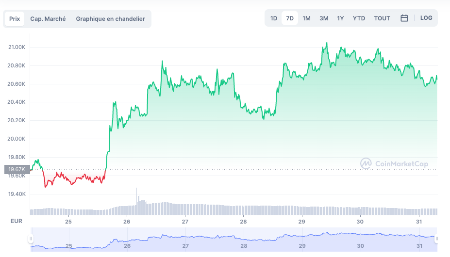 Évolution du Bitcoin sur ces 7 derniers jours @CoinmarketCap (BTC/EUR)