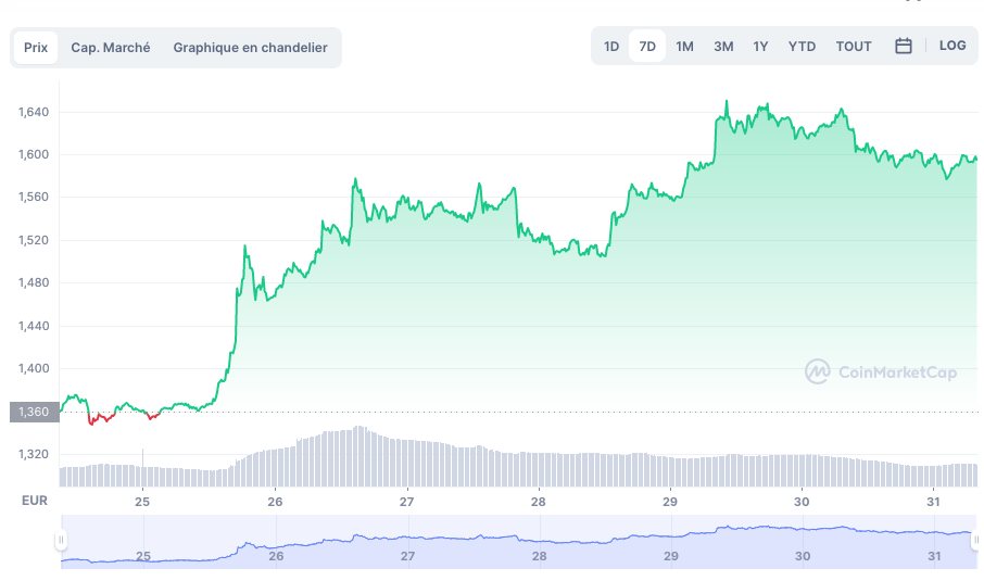 Évolution de l’Ether sur ces 7 derniers jours @CoinmarketCap (ETH/EUR)
