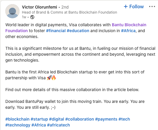 Bantu est ainsi devenu la première société blockchain dirigée par des Africains à rejoindre le programme Fast Track de Visa, qui permet à leurs partenaires financiers de créer plus rapidement et plus facilement de nouvelles expériences commerciales sur le réseau de paiement de Visa.