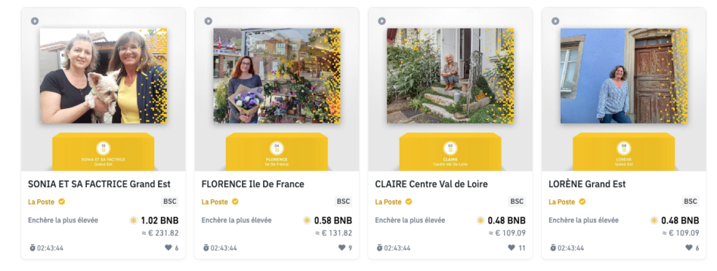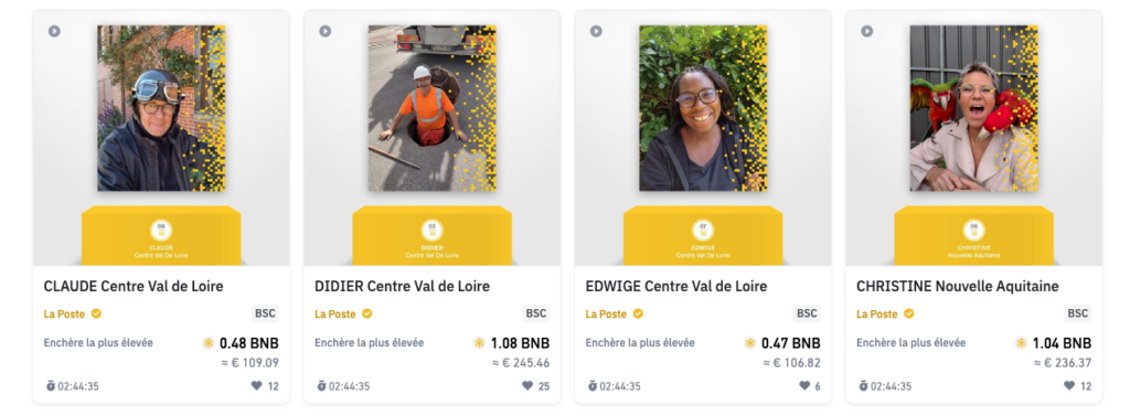 En collaboration avec Yann Arthus Bertrand, photographe, reporter, réalisateur et militant écologiste français et président de la Fondation GoodPlanet, la Poste édite une exposition virtuelle aux enchères intitulée « Visages de France des Facteur ». Sur les plus de 4000 photos présentées, 10 ont été converties en NFT et arborent les portraits des personnes rencontrées par les facteurs dans toute la France aux couleurs du groupe. La collection est actuellement disponible sur Binance NFT et tous les profits amassés pour cette vente aux enchères caritative seront reversés à la Croix-Rouge, très active dans l’aide humanitaire pour l’Ukraine et qui a décidé récemment d’intégrer dans ses actions des approches qui tiennent compte des changements climatiques et de l’urgence écologique (source).