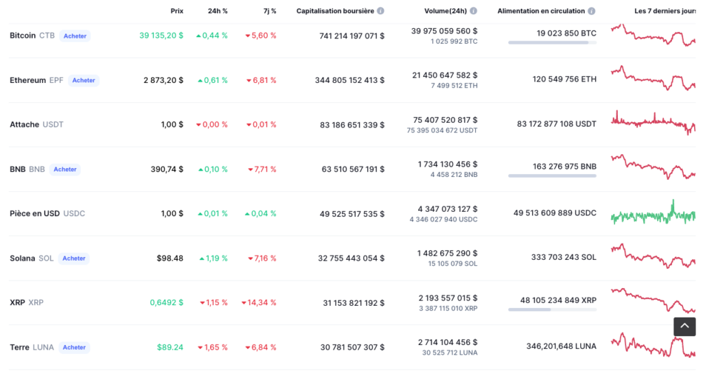 Durant les 7 derniers jours, les cryptomonnaies sont dans le rouge, comme on peut le constater sur la graphique suivant :