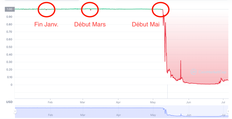 L’USTC (UST) est un stablecoin algorithmique. Dans son cas de figure, les revenus d’intérêts ne permettaient pas de couvrir le paiement effectif des rendements, l’USTC (UST) était trop vulnérable aux conditions de marché car il reposait donc uniquement sur la confiance des investisseurs et cette confiance a été rompue avec la baisse du marché crypto (en savoir plus). Cette vulnérabilité aux conditions de marchés s’observe pour les stablecoins algorithmiques.