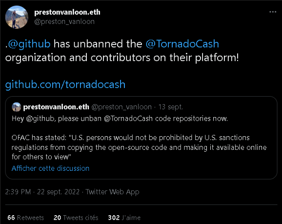 Le mois dernier, après l’interdiction du Trésor américain, l’OFAC, GitHub avait supprimé le code de l’outil de son site Web. La plateforme de partage de code semble avoir soudainement levé son interdiction. Après les appels nombreux des développeurs sur Ethereum à ne pas interdire arbitrairement le code de Tornado Cash sur la base de simples soupçons.
