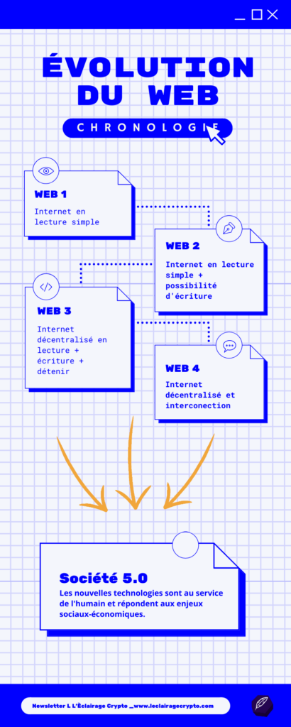 Avec cela et un marché crypto en plein essor, de nombreux développements blockchain sont à venir et avec eux, de nouvelles opportunités à l’ère de la société 5.0. En effet, dorénavant, l’innovation web 3 passe aussi par l’intégration de l’AI ou l’IoT et permet ainsi d’aller encore plus loin avec la technologie blockchain. Du Web 3.0 au Web 4.0, les contours de l’industrie 4.0 se dessinent et la Société 5.0 devient réalité.