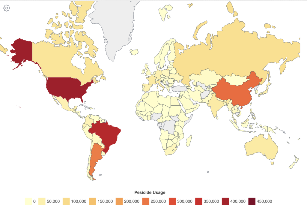 La Chine est actuellement le pays qui utilise le plus de pesticides, avec une utilisation annuelle d’environ 262 700 tonnes d’après le World Population Review. Cette forte utilisation est attribuée à sa grande population et au besoin de produire davantage de nourriture, surtout dans certaines régions de Chine qui sont encore en développement et qui pourraient ne pas disposer d’alternatives aux pesticides pour l’agriculture. Suivant la Chine, les États-Unis sont un autre grand utilisateur de pesticides, avec une utilisation annuelle d’environ 407 779 tonnes. Parmi les autres utilisateurs significatifs, on trouve le Brésil, l’Argentine, la Russie et le Canada, chacun utilisant des dizaines de milliers de tonnes de pesticides chaque année​​.